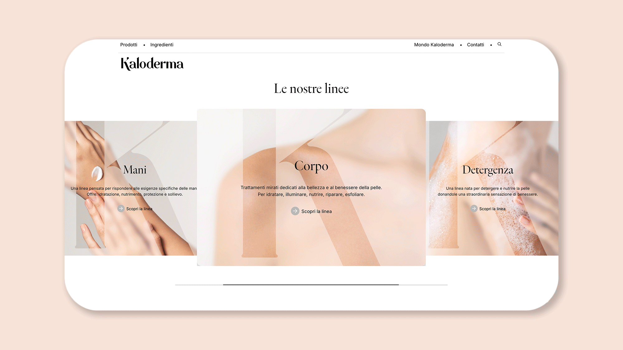 Kaloderma, brand del gruppo Ludovico Martelli S.p.A., ha intrapreso un percorso di rebranding e digital transformation volto a rafforzare la percezione del marchio come realtà moderna e dermocosmetica, per allinearsi alle richieste del mercato e dei segmenti Skin Lab e Skin Beauty. La realizzazione del sito web entra in pieno in questo processo evolutivo: un progetto dalla funzione strategica che privilegia l’esperienza dell’utente, di grande appeal estetico.