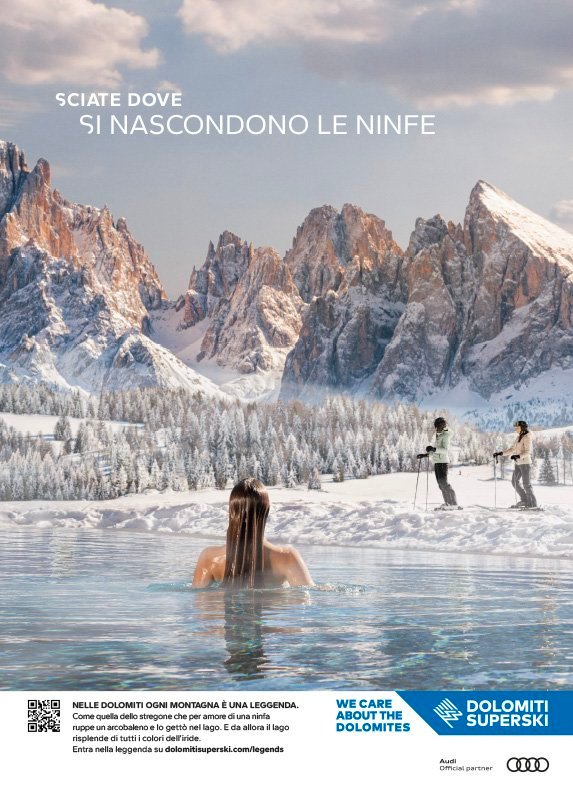 “Nelle Dolomiti ogni montagna è una leggenda”, dichiara il claim della campagna ideata da White Red & Green, mentre in un’atmosfera onirica sciatori e visitatori si muovono in un paesaggio che li trasfigura, con un tone of voice leggendario.