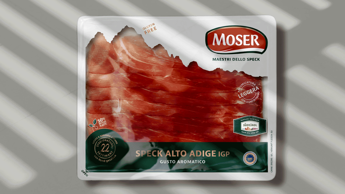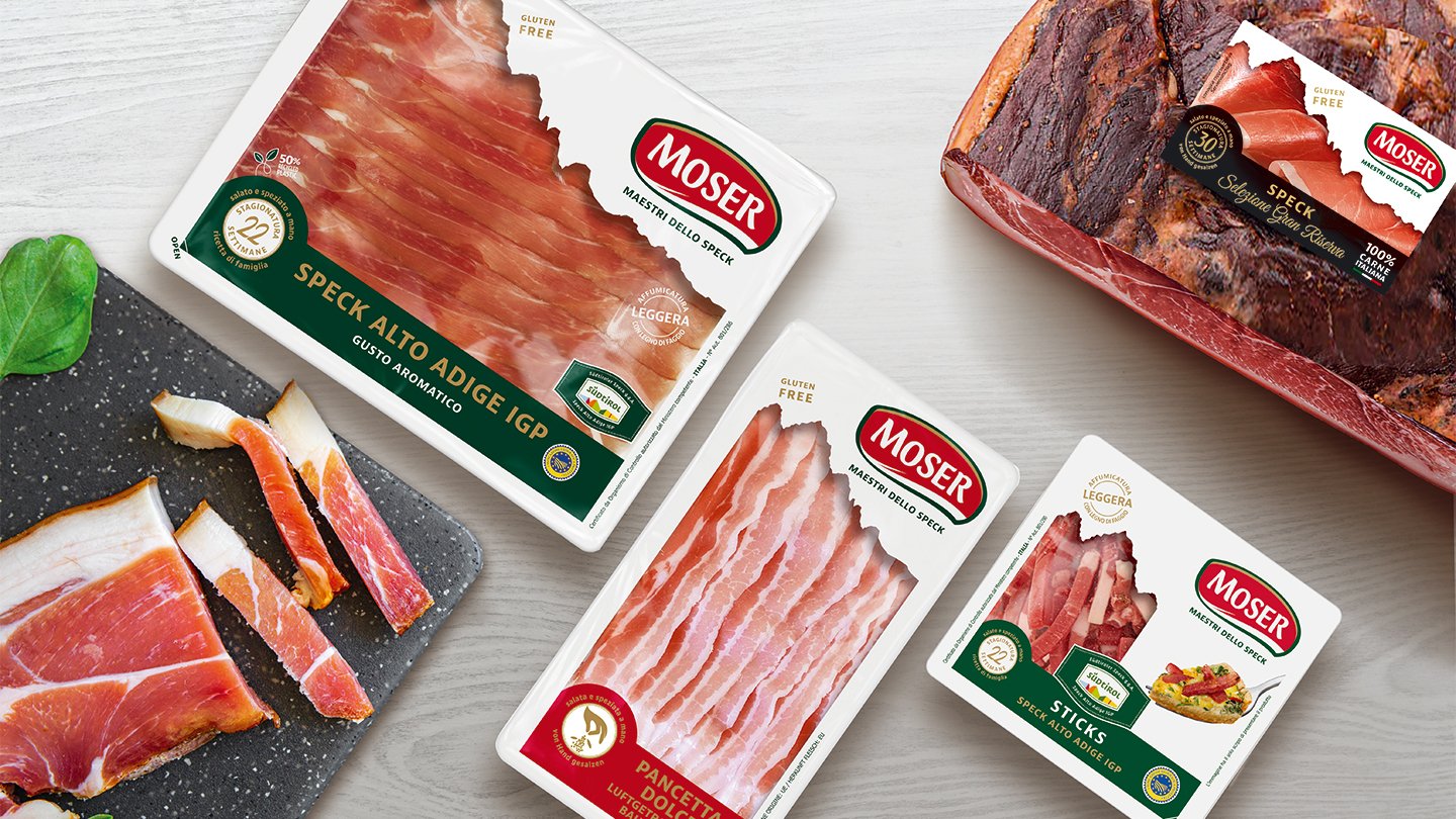 Moser, brand leader nella produzione di speck di alta qualità, da oltre 50 anni è un marchio affidabile, vicino al consumatore e con un forte appeal per target giovani e non. Per rafforzarne il posizionamento e veicolare i concetti di piacere, bontà ed eccellenza, è stato sviluppato un restyling dei packaging che ha puntato sulla contemporaneità e sulla valorizzazione delle singole linee di prodotto.
