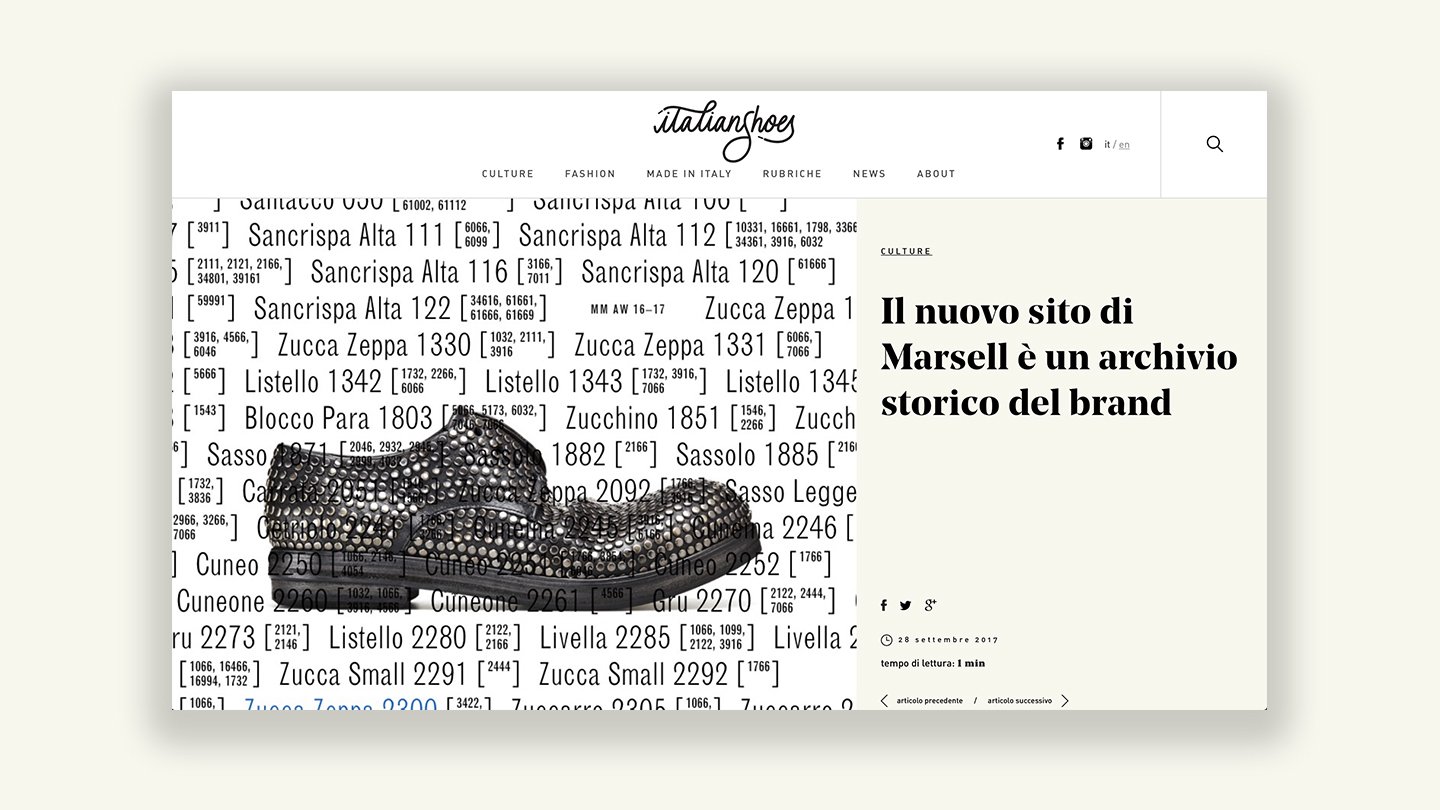 Per celebrarla con storie sempre nuove e seguirla dalla produzione alle passerelle, dall’artigianato all’innovazione, Assocalzaturifici lancia Italian Shoes, una piattaforma di comunicazione digitale, e una pagina Facebook, che fa cultura sulla scarpa italiana e la porta, ancora una volta, in tutto il mondo. White, Red & Green ha curato progettazione, sviluppo sito e contenuti.