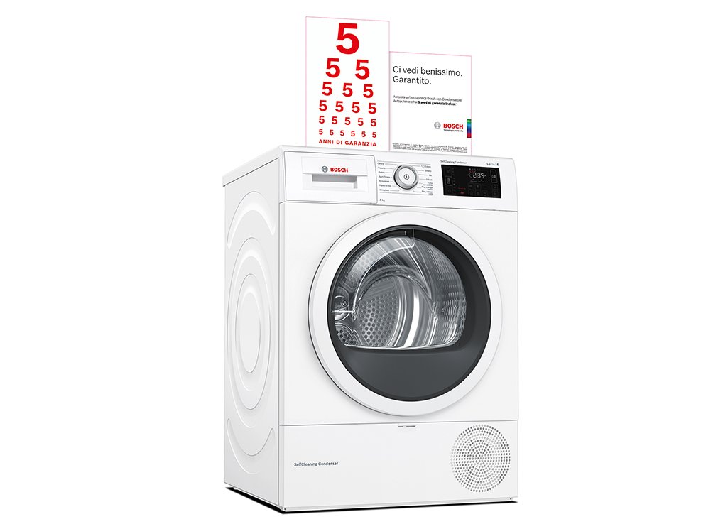 White, Red & Green ha realizzato un crowner e un’adesivo per il punto vendita che comunicano i 5 anni di garanzia offerti a fronte dell’acquisto di un’asciugatrice Bosch. I materiali con il messaggio “Ci vedi benissimo. Garantito” riprendono i codici visivi delle tavole optometriche, evidenziando in modo ironico e originale la promozione in oggetto.