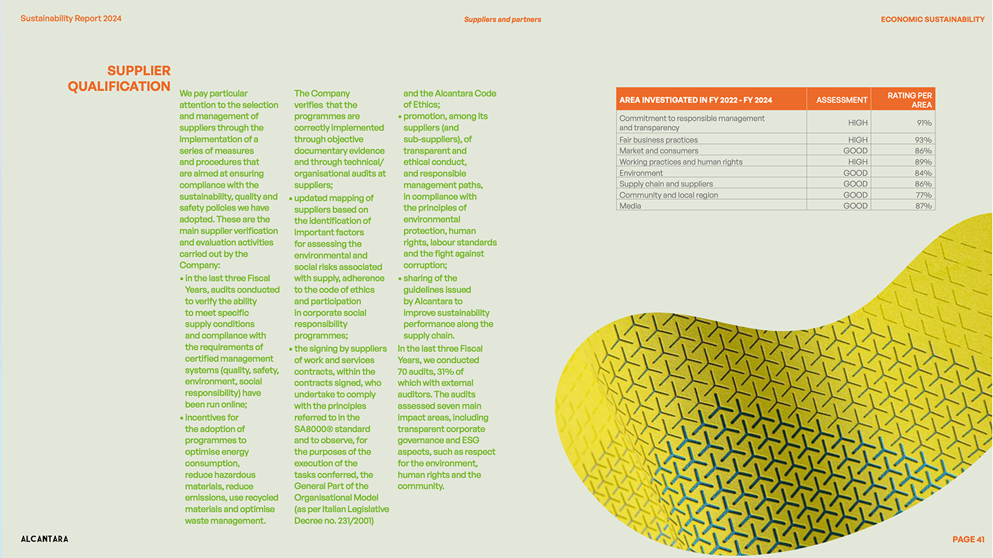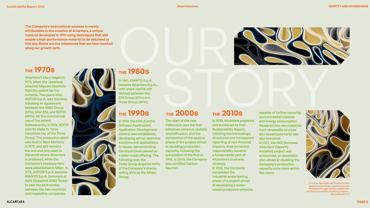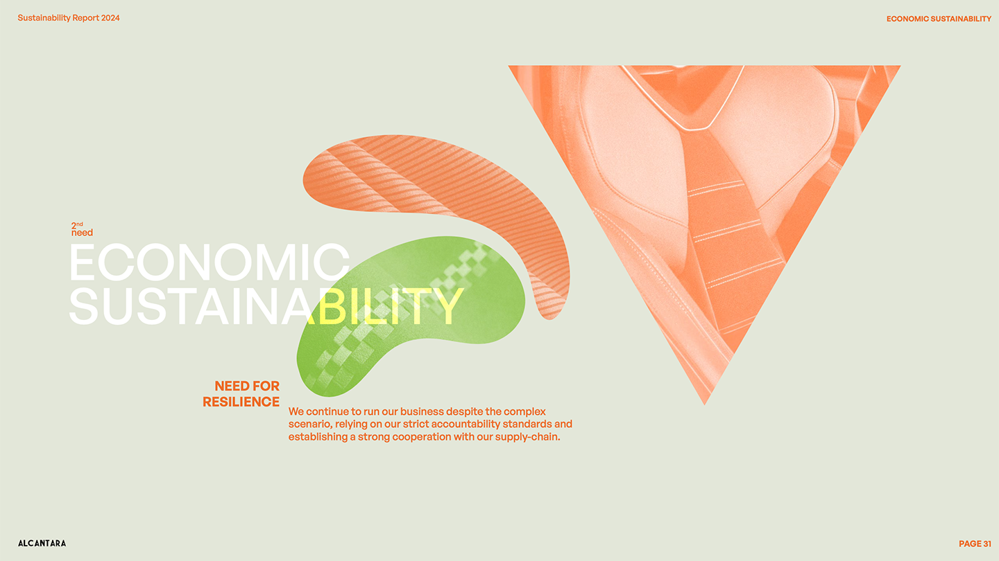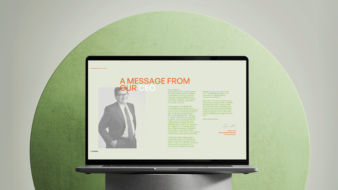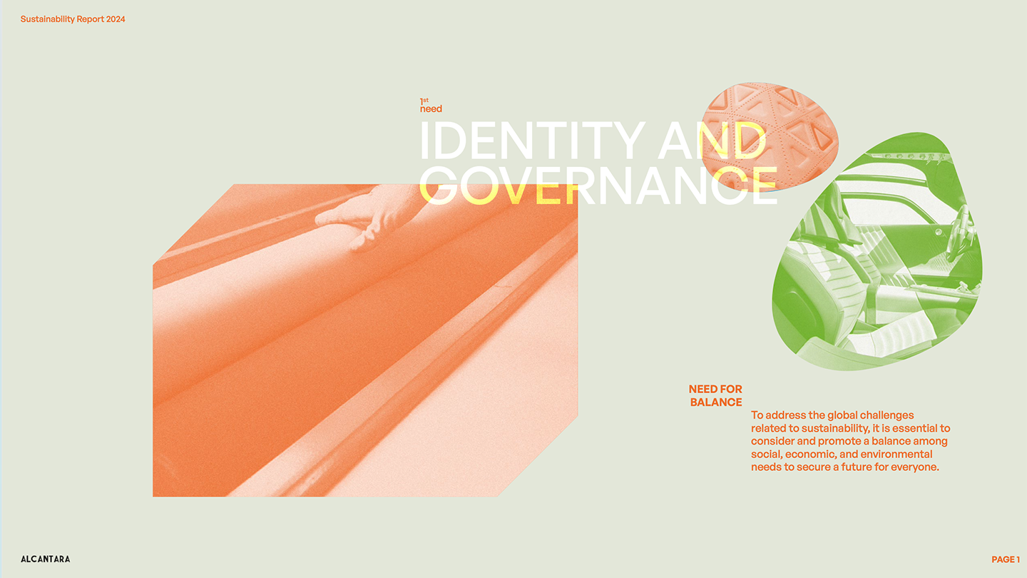 E l’eccellenza del brand coinvolge anche la sostenibilità, come testimonia l’ultimo Bilancio di sostenibilità che sviluppa un preciso concept: Alcantara si impegna a trovare un equilibrio nei bisogni ambientali, sociali ed economici per garantire un futuro per tutti.