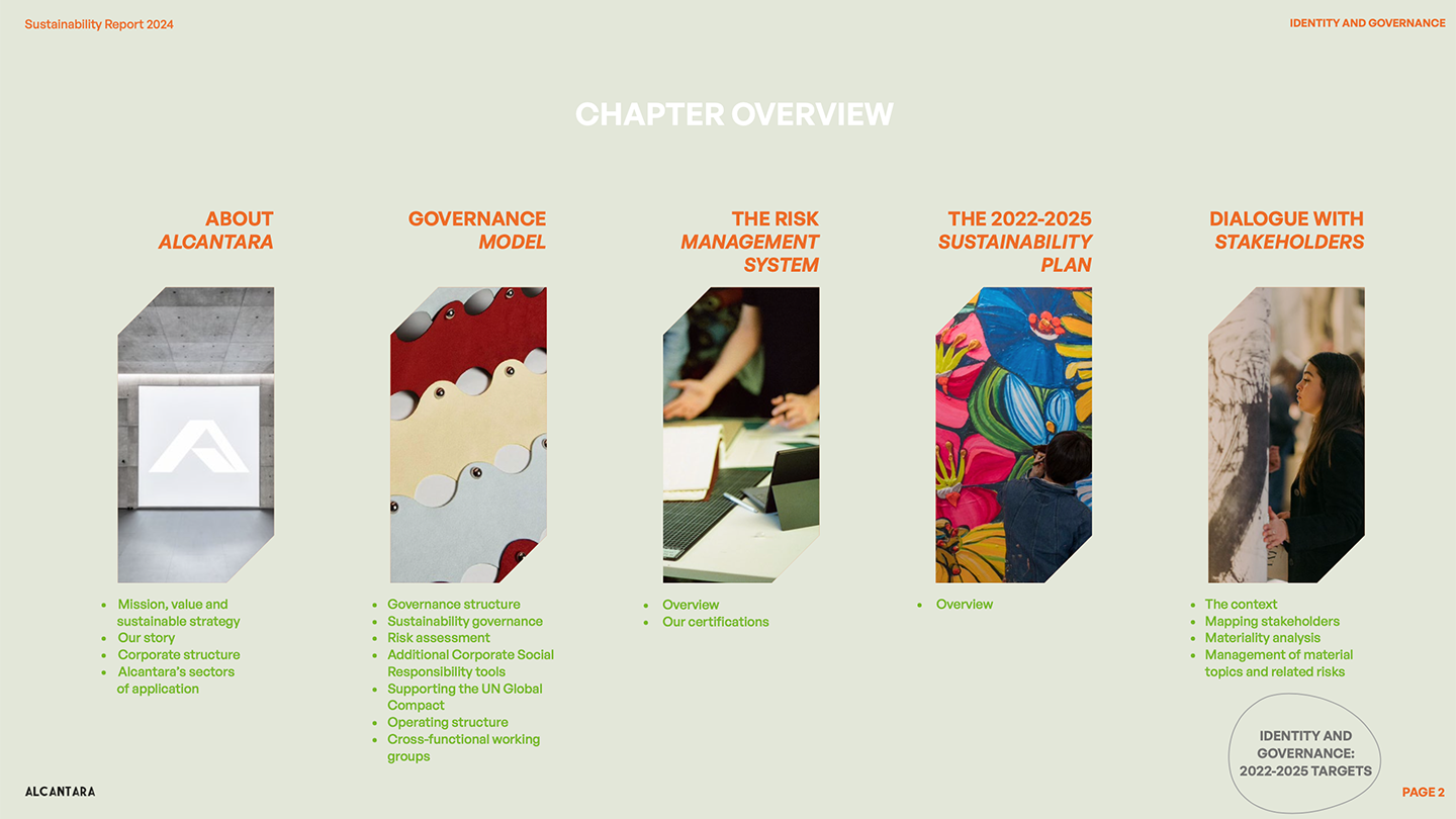 Alcantara risponde alla necessità di equilibrio valorizzando le proprie risorse e portando avanti una visione innovativa e responsabile. Il bilanciamento tra bisogni e priorità si declina pagina dopo pagina attraverso scelte grafiche impattanti, forme e geometrie perfettamente simmetriche, linee moderne, cromie che richiamano i toni del verde in tutte le sue sfumature.